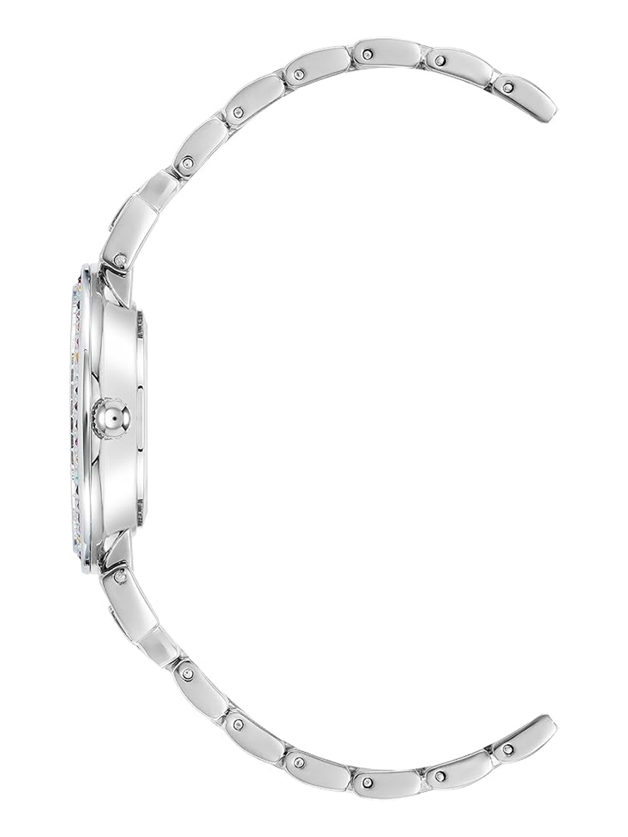 White dial with silver-tone hands, Roman numerals and rainbow colored premium crystal markers.