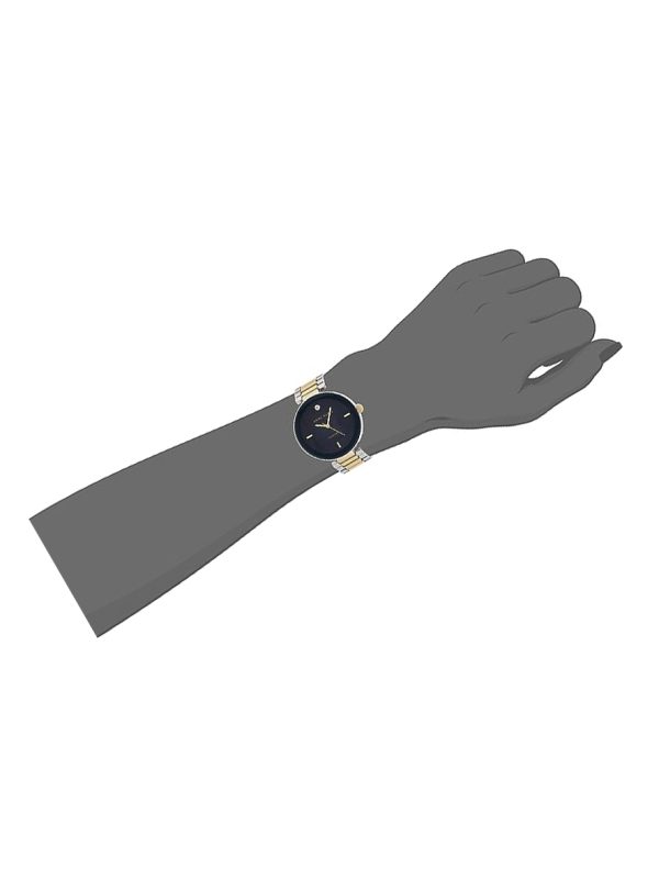Navy blue sunray dial with genuine diamond at 12; gold-tone hands and markers