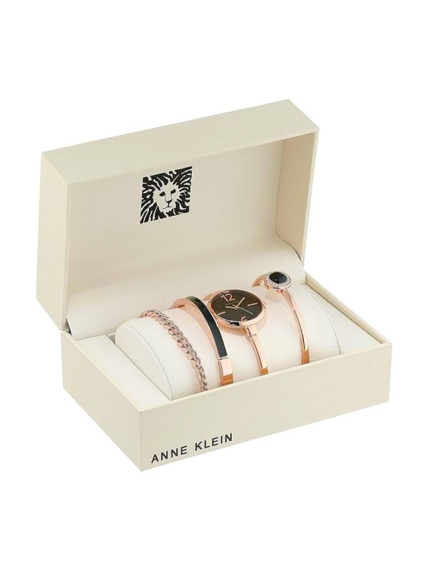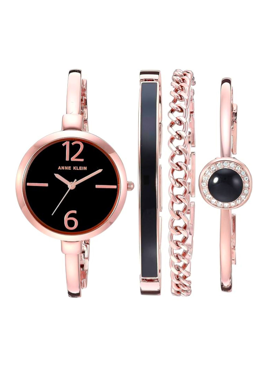 Anne Klein Women’s Bangle Watch and Premium Crystal Accented Bracelet Set Black Rose Gold