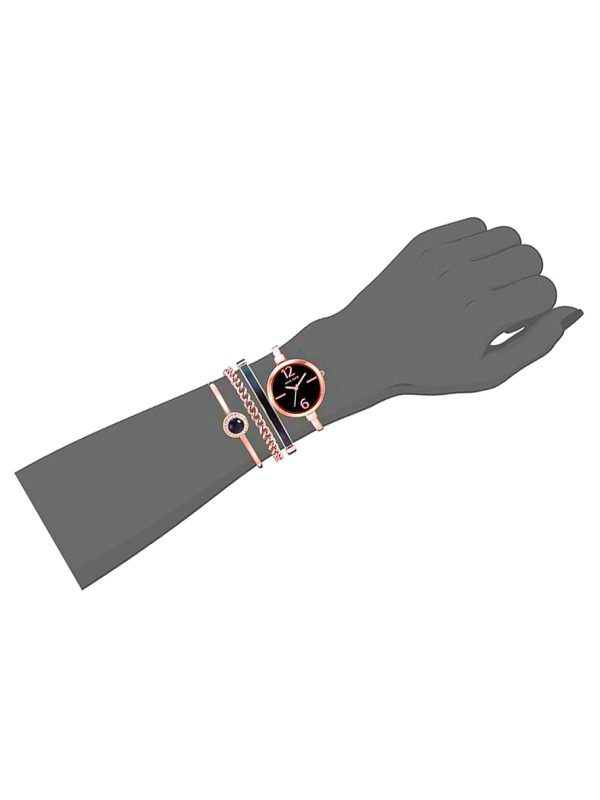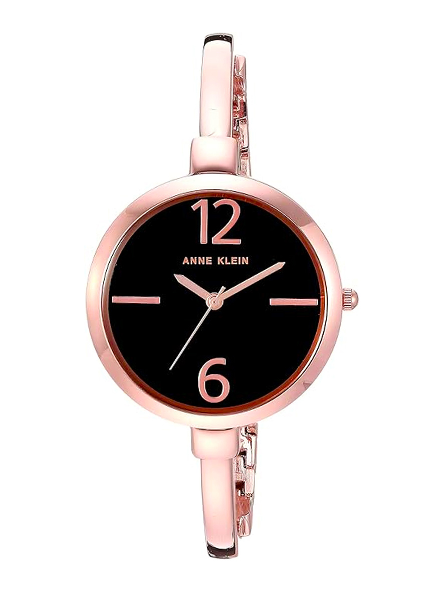 Slightly domed mineral crystal lens; black glossy dial with rose gold-tone hands and markers; rose gold-tone bangle with adjustable end links; jewelry clasp and extender