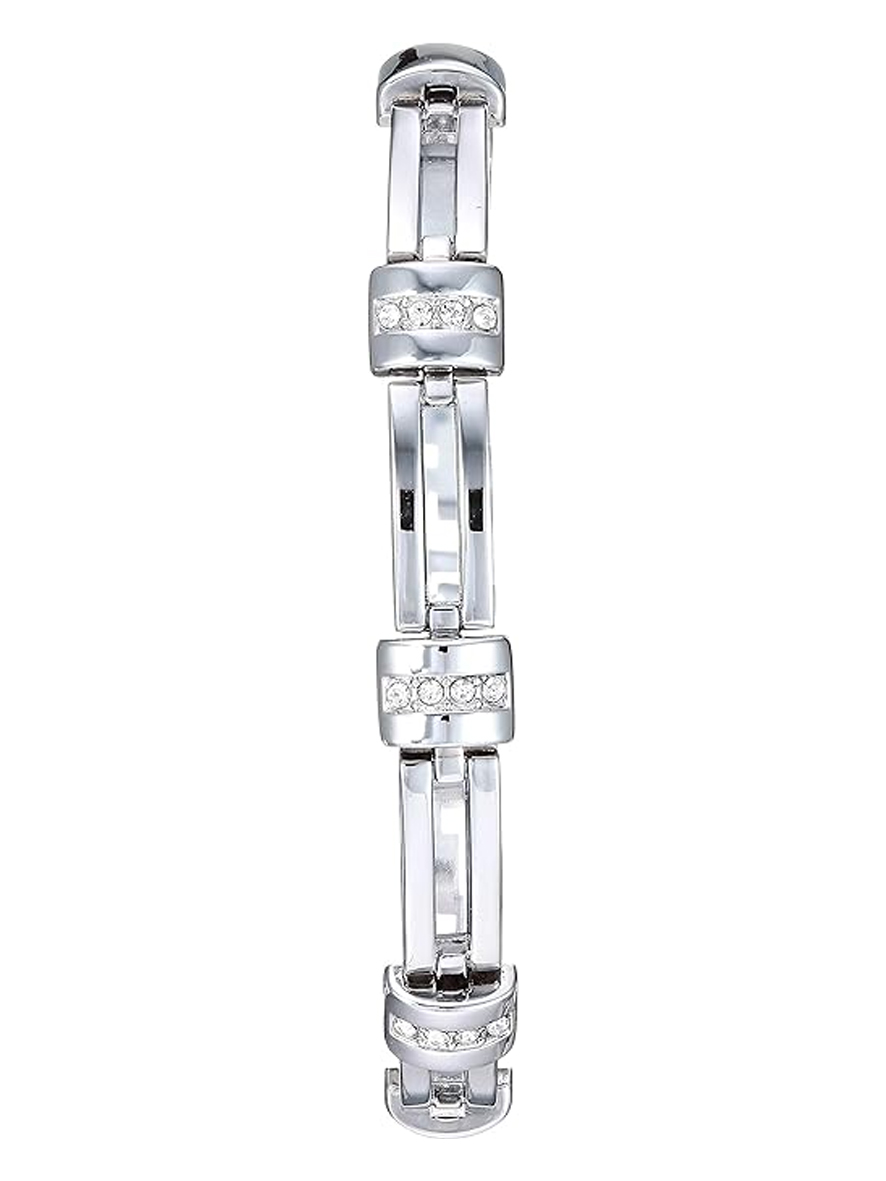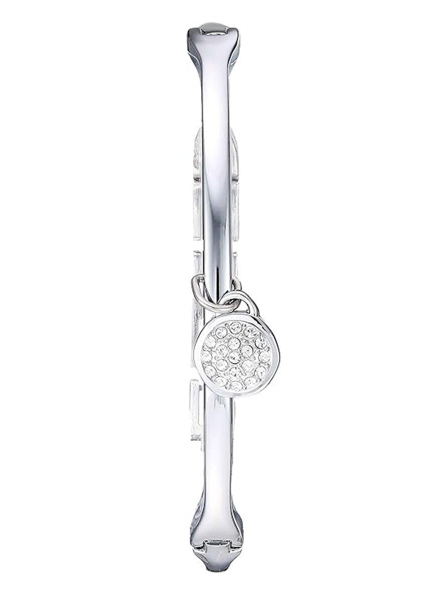 Bezel set with 40 clear premium crystals. White dial with silver-tone hands and markers. Silver-tone bangle with 36 clear premium crystals. Adjustable end links. Jewelry clasp and extender.
