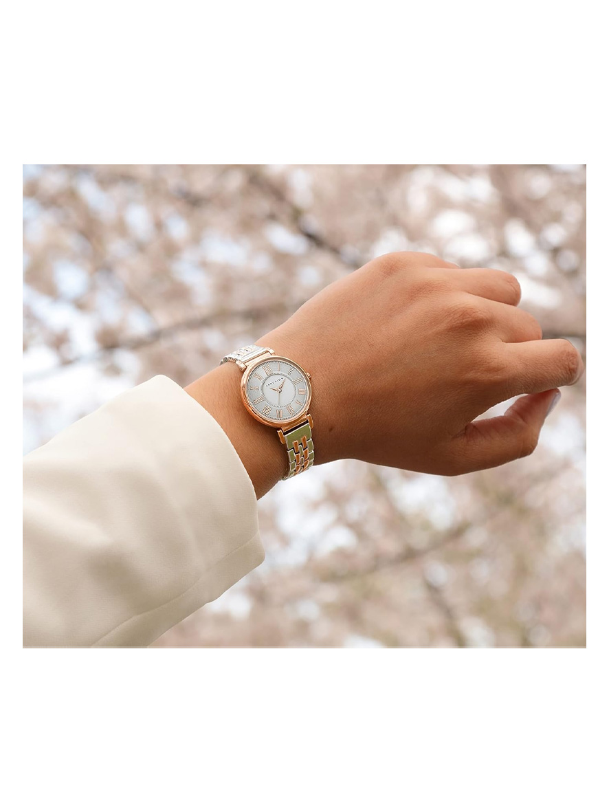 Silver-tone dial with rose gold-tone hands and Roman numerals; black printed inner and outer minute track.
