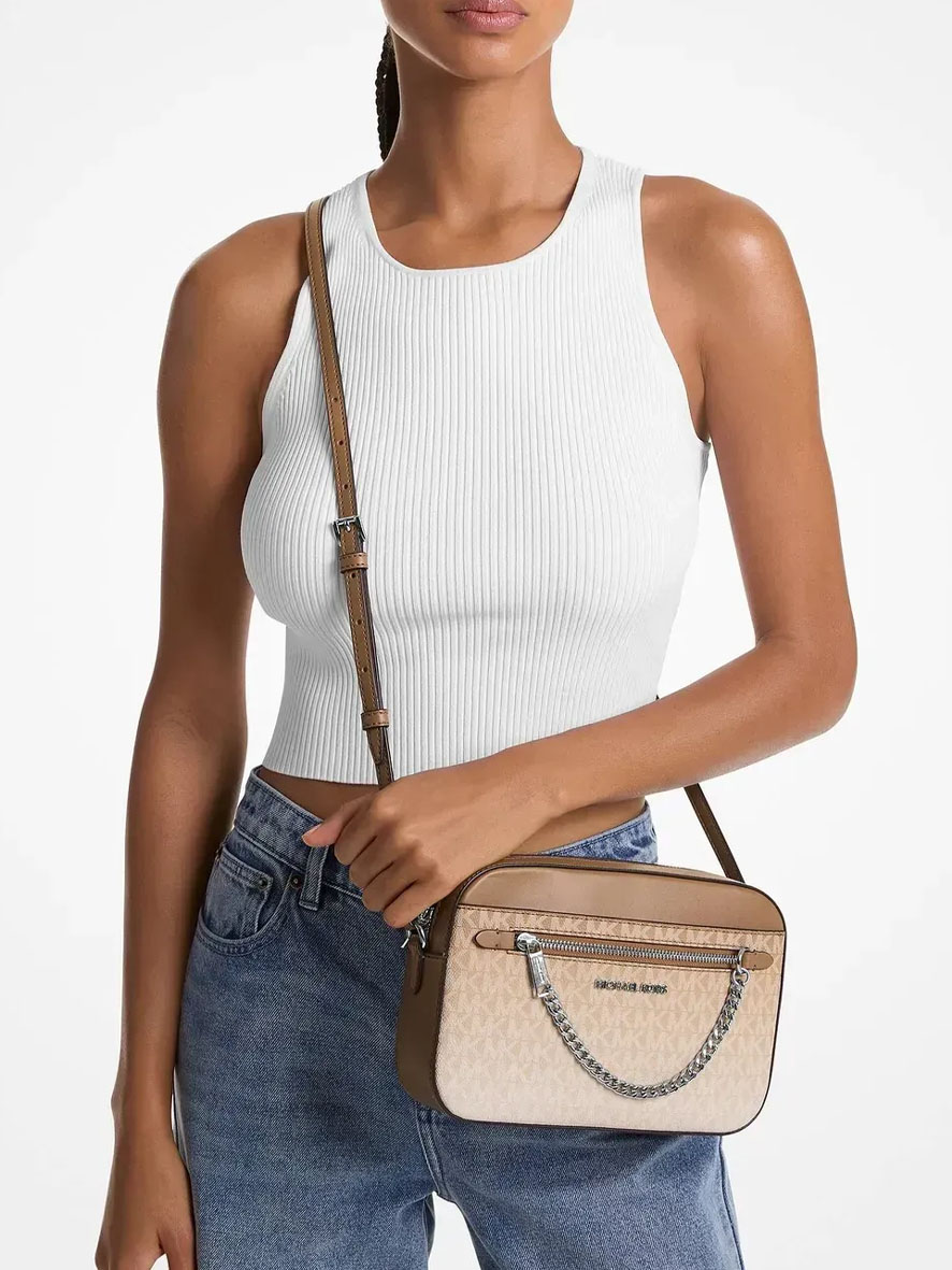 Crafted from ombré Signature-print canvas for novelty appeal, the Jet Set crossbody bag is designed in a sleek, compact silhouette. A polished chain-link zipper pull delivers standout style, while the pocketed interior is perfectly sized for a day’s worth of essentials. Wear it while commuting, running errands or taking a weekend getaway.