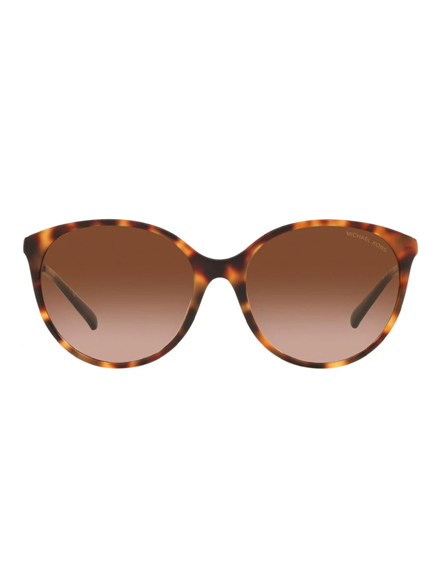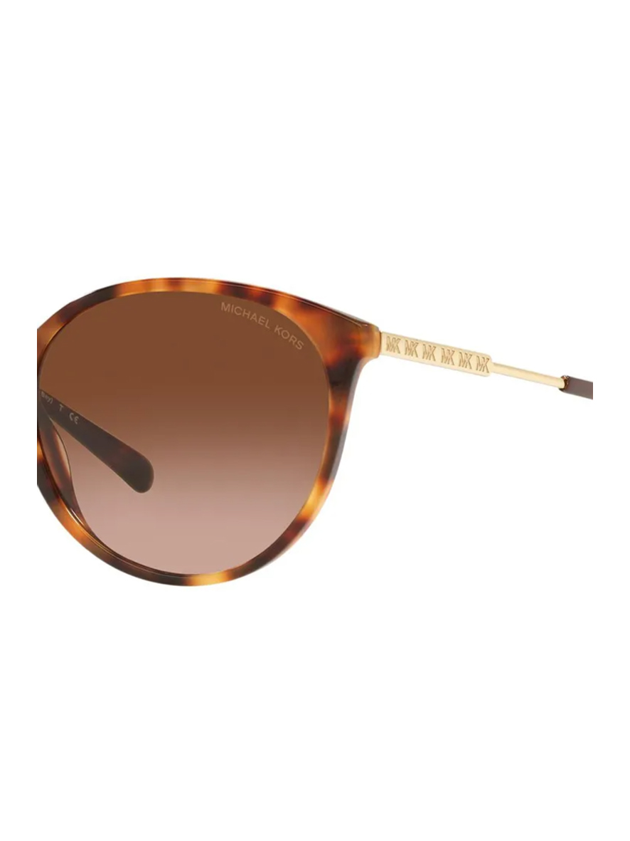 This Michael Kors sunglasses comes in a amber tortoise frame with brown gradient lenses. Full rim sunglasses in a round shape.