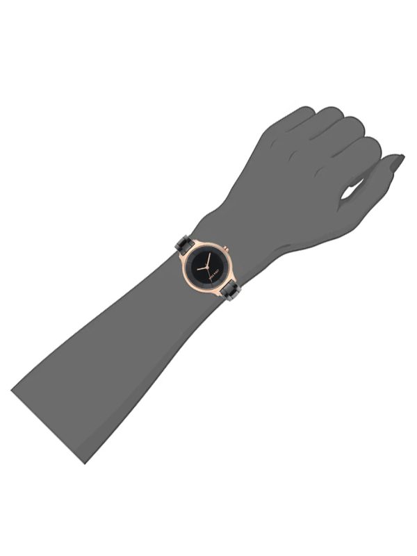 Slightly domed mineral crystal, matte black dial with raised markers and rose gold-tone hands.