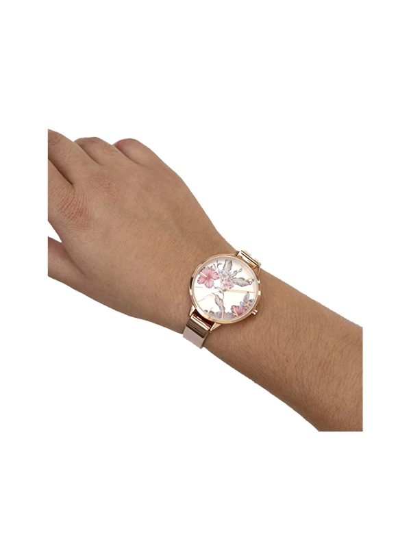 Mineral crystal lens; light rose gold-tone textured dial with 3d printed floral design; rose gold-tone hands and markers.