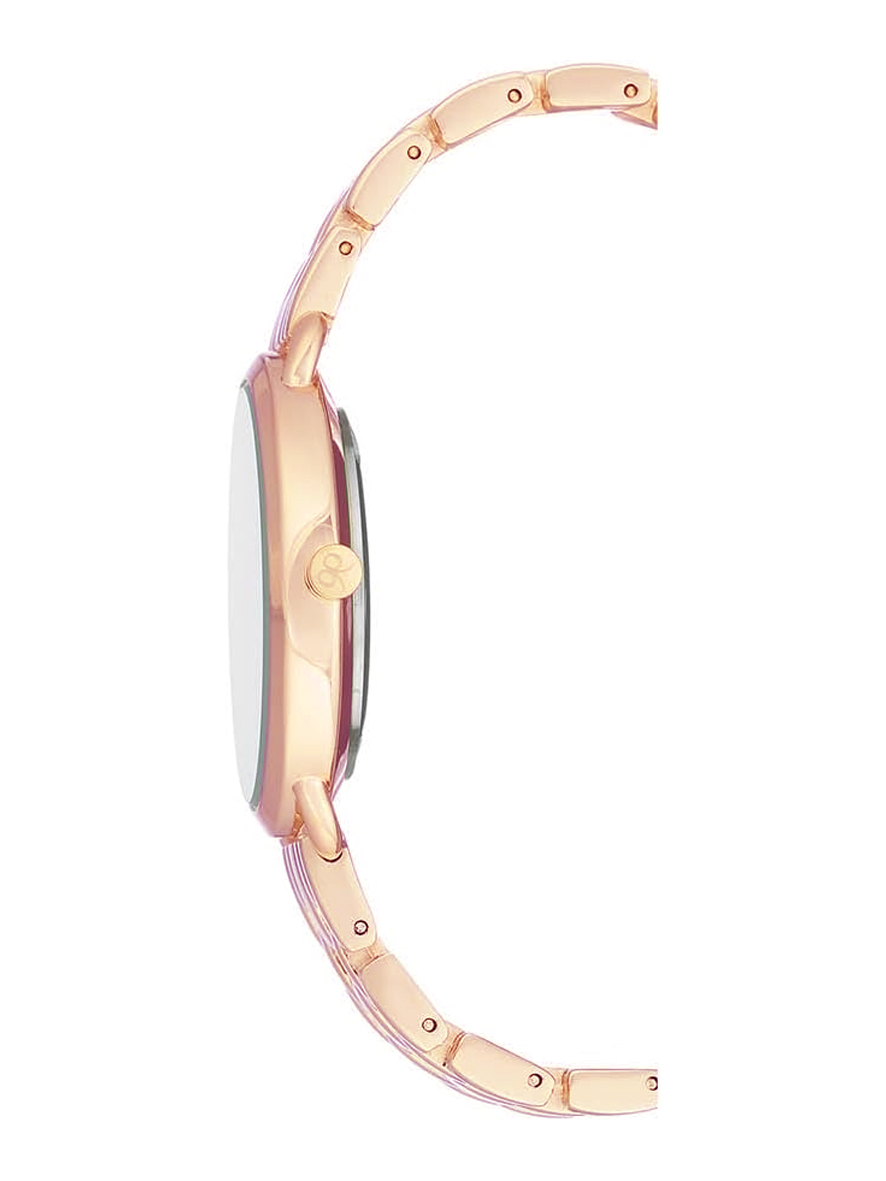 Mineral crystal lens; light rose gold-tone textured dial with matching hands and crystal accented markers.