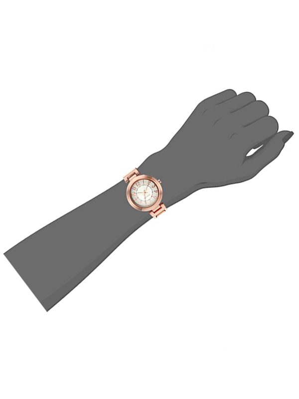 Mineral glass lens with rose gold-tone hands and easy-to-read numbers. Interior marked with 12 clear crystals. Adjustable link bracelet with folding clasp and double safety button. Japanese quartz movement.