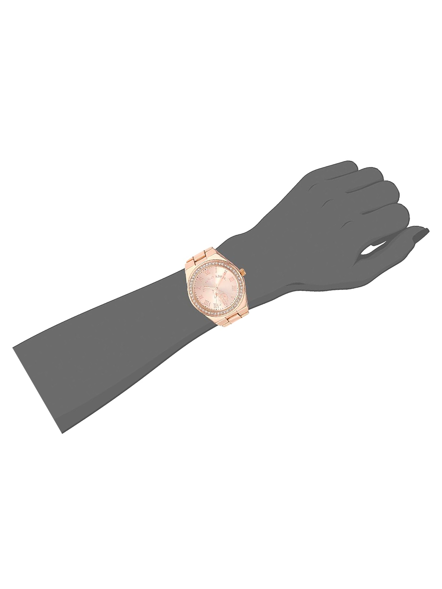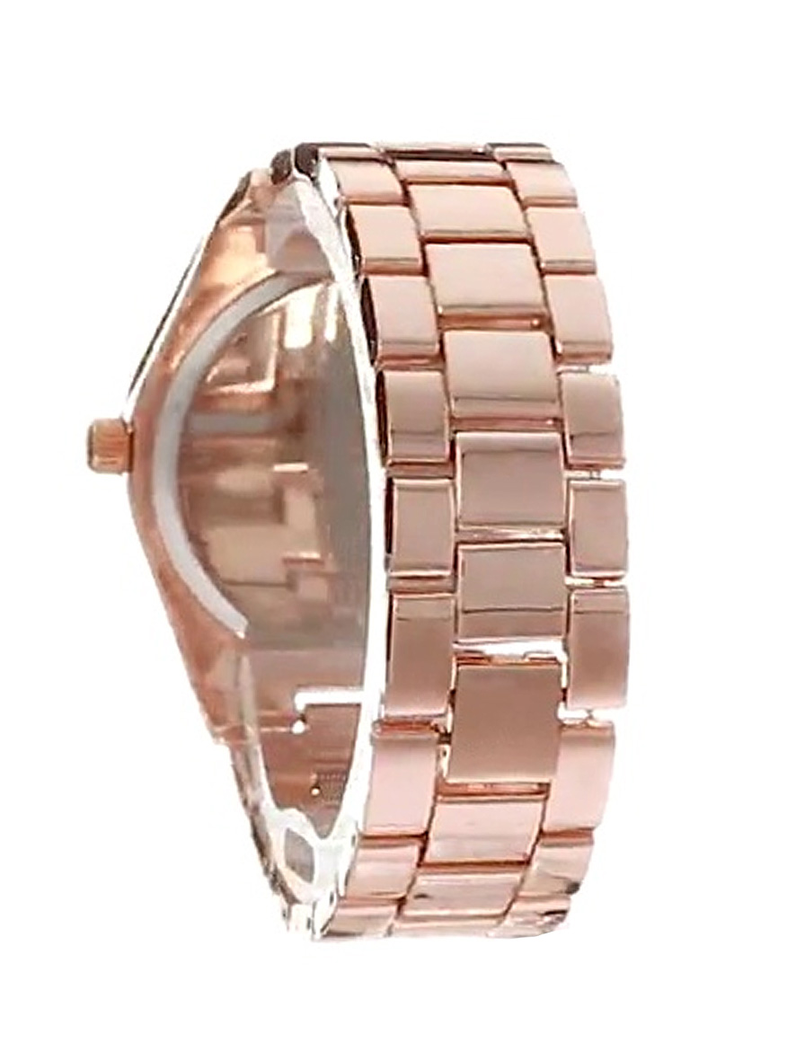 Rose Gold bracelet watch with crystal with ridges design around the rose gold bezel .