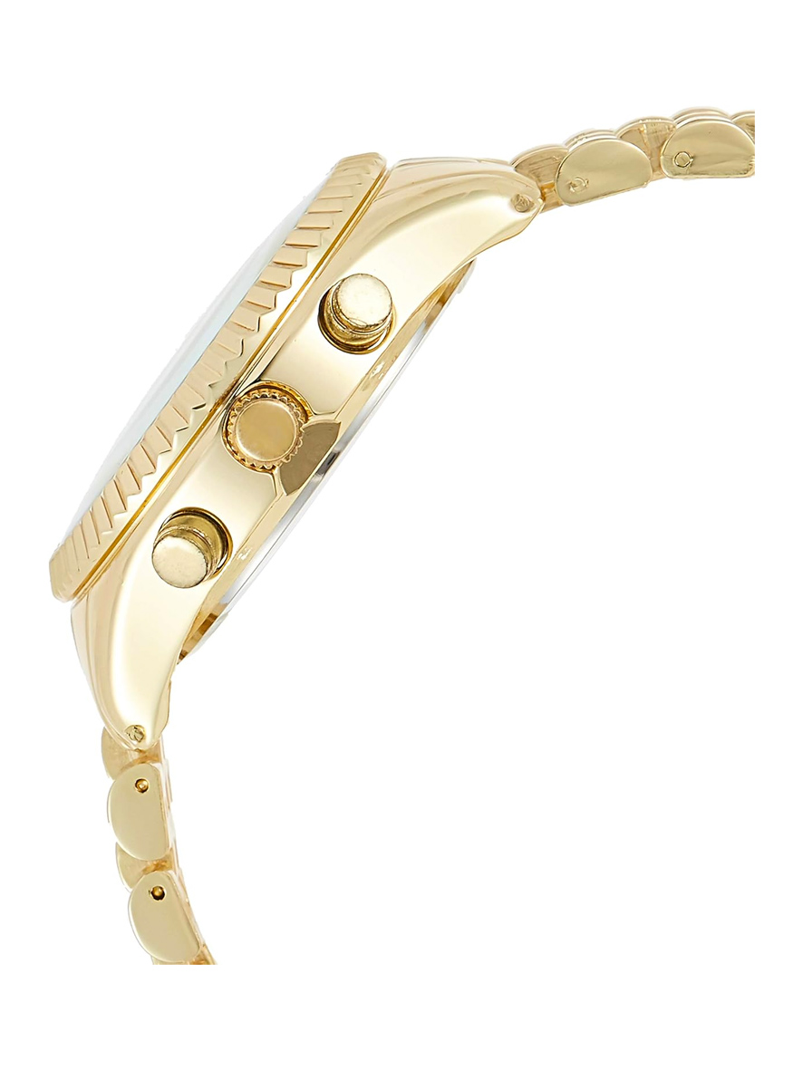 This stunning timepiece features a sleek gold-tone bracelet with notched design around the bezel adds a touch of unique, eye-catching detail. With its analog display, this watch provides a classic and timeless feel, ensuring that it never goes out of style. The gold tone markers with unique roman numerals creates a visually striking appearance that is sure to turn heads. Powered by quartz movement, it offers precise timekeeping so you’ll never miss a beat.